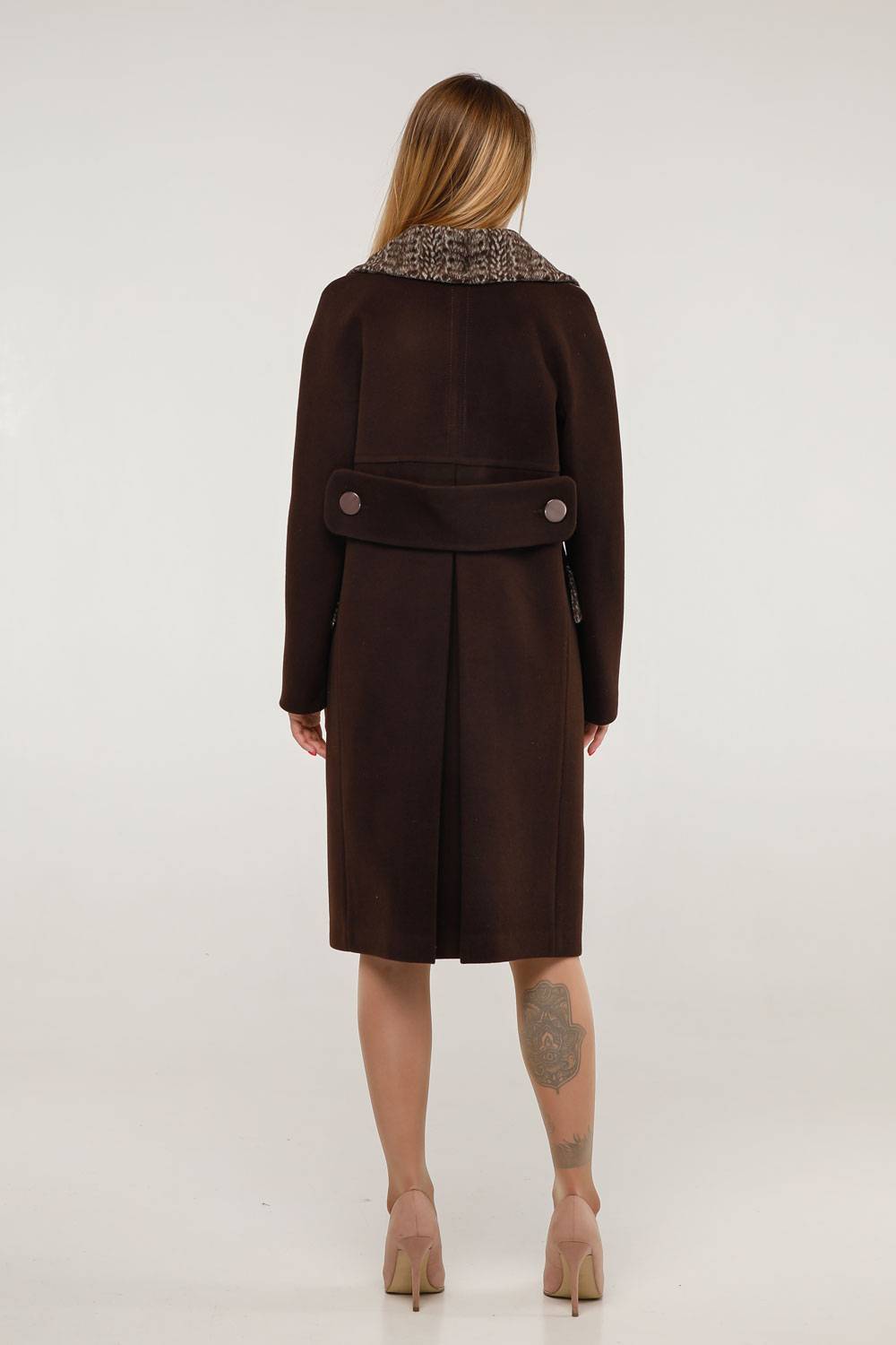 Пальто отрезное по спинке, декорировано отстегивающимся патом по талии и встречной складой