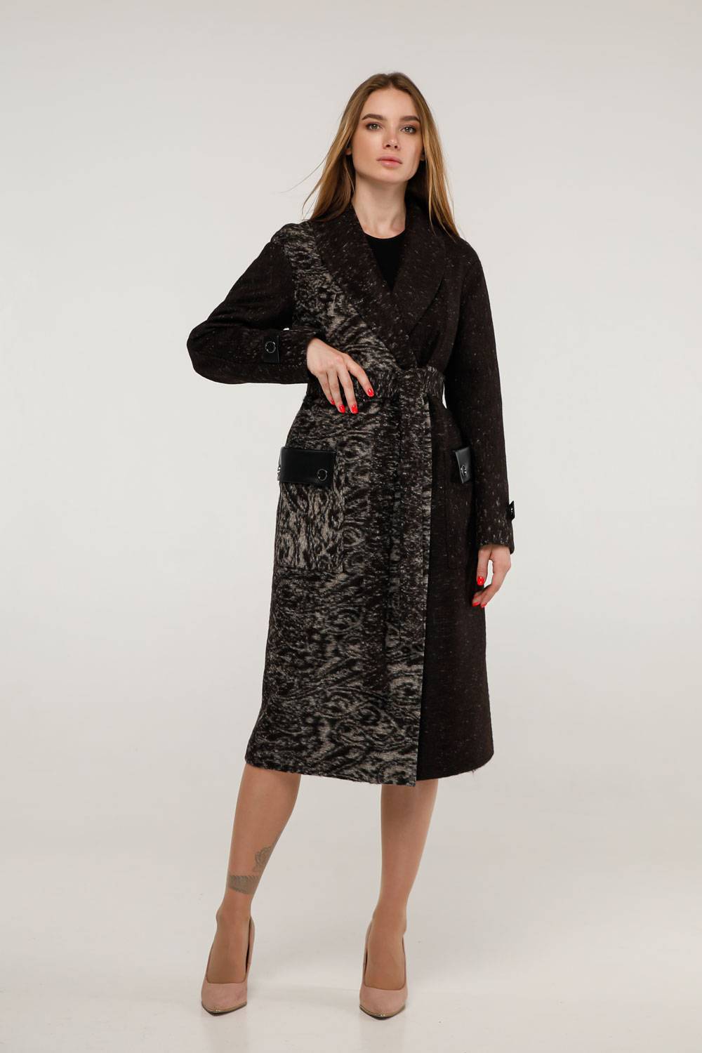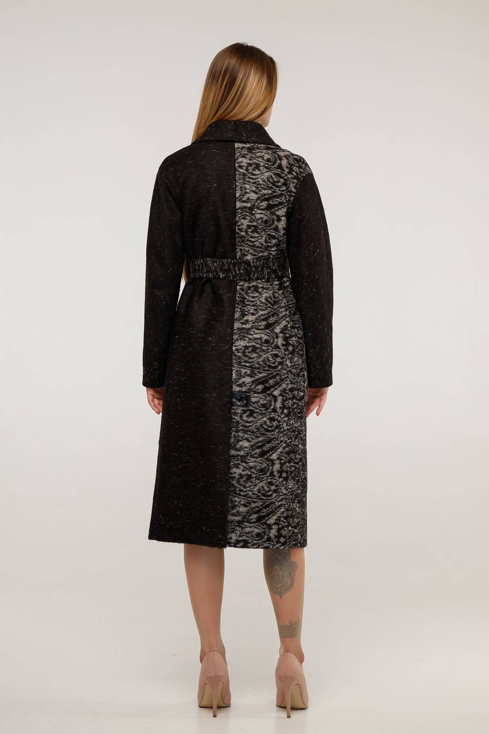 Пальто женское двубортное демисезонное, выполненное из двух тонов шерстяной ткани, прямого силуэта с втачным рукавом и приспущенным плечом. Изделие с отложным шалевидным воротником