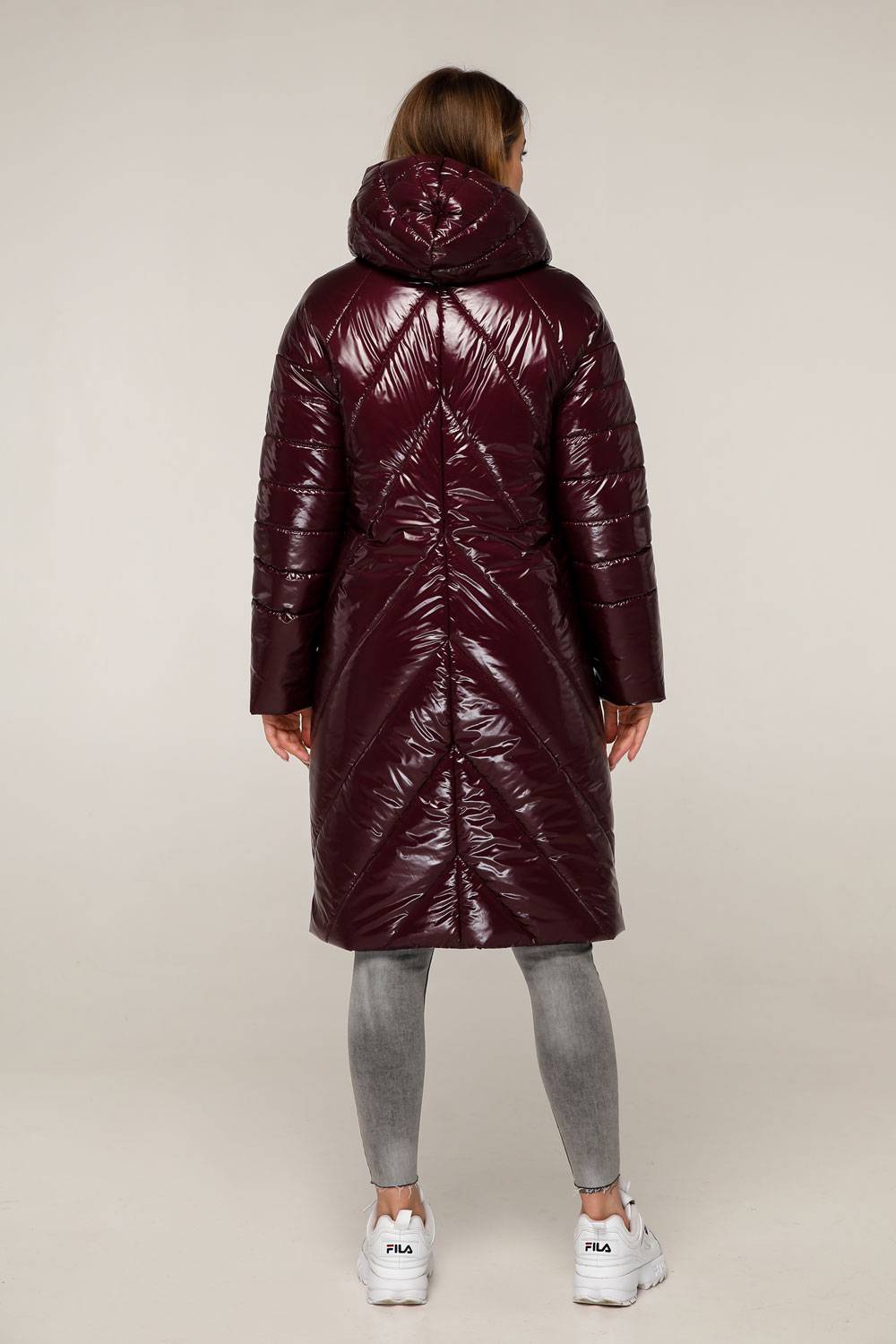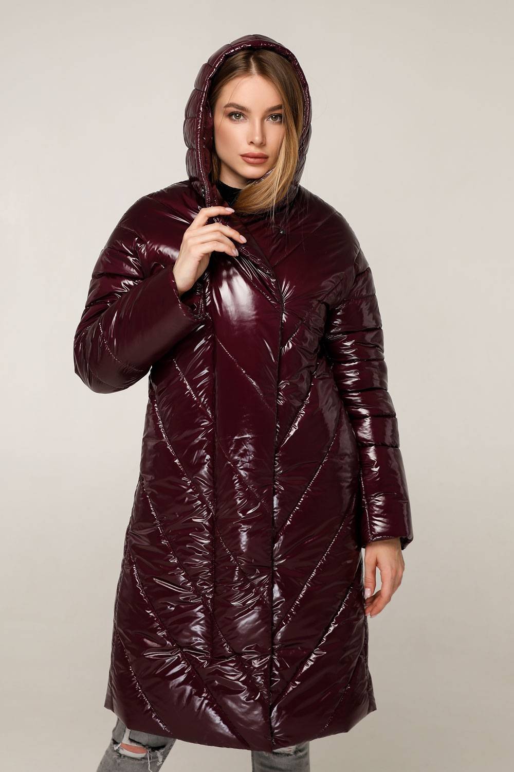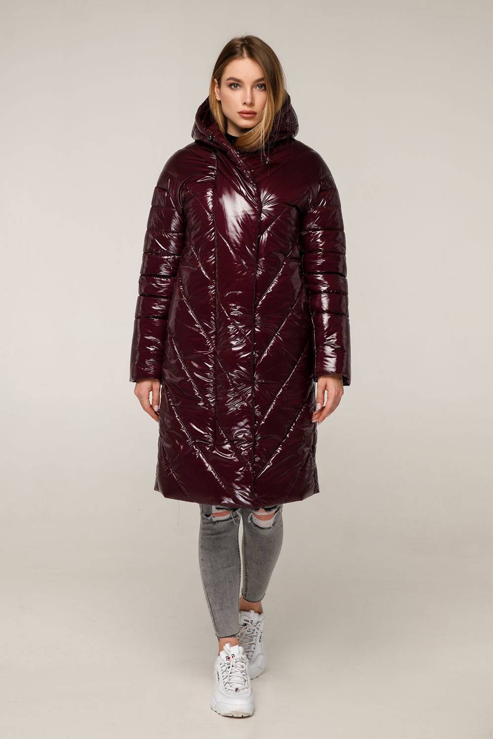 Пуховик стеганный женский зимний, выполнен из плащевой ткани, полуприлегающего силуэта с втачным рукавом с приспущенным плечом